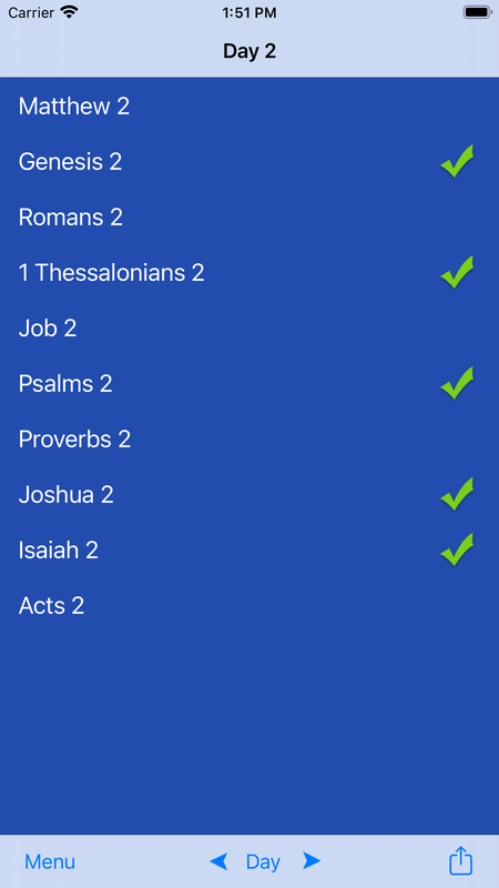 We hope that you will benefit from this app and that it will help you read through your Bible every day. Please share this app with your friends, and make sure to rate and review it. Also, let us know what features you'd like to see in the future updates via the "Provide Feedback" link in the menu of the app. |